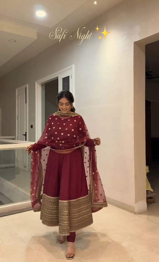 Wine & Dark Peach Premium Anarkali Suit Set with Sequin Embroidery and Dupatta