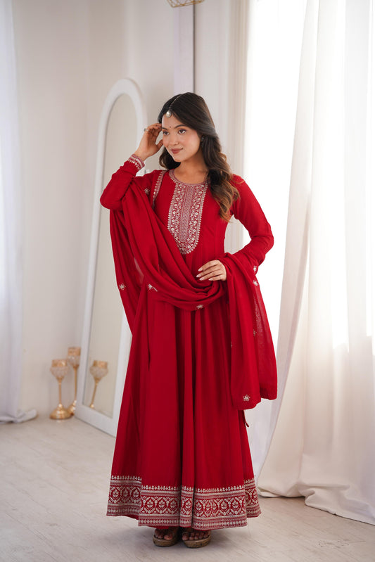 Red Soft Fox Georgette Anarkali Suit Set with Flared Gown, Dupatta & Pants
