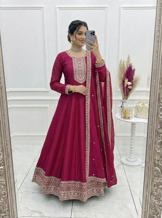 Dark Pink Vichitra Silk Anarkali Gown Set with Embroidered Dupatta