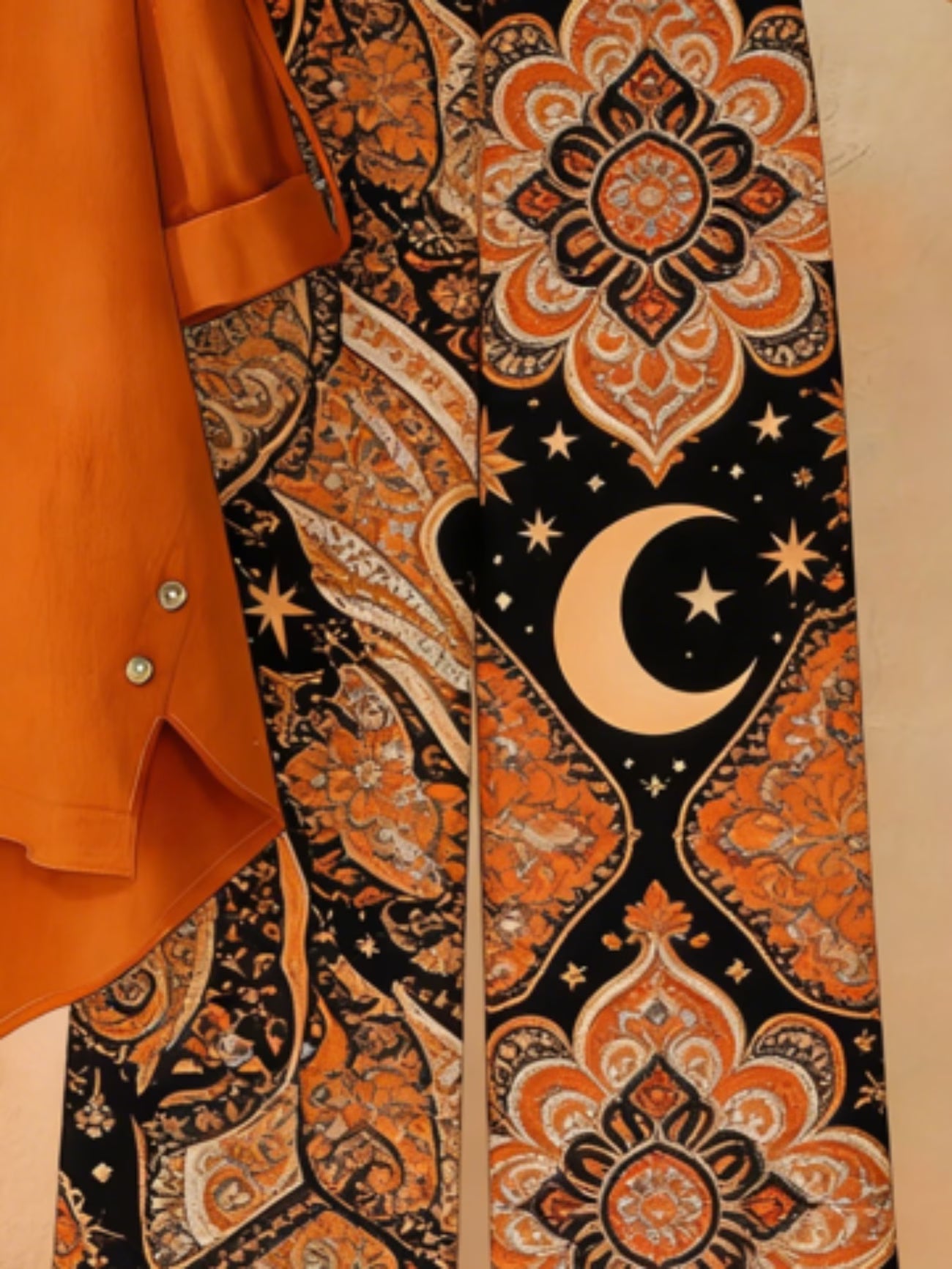 A beautifully balanced design featuring a refined solid top paired with graceful botanical print trousers — made for women who love effortless sophistication.