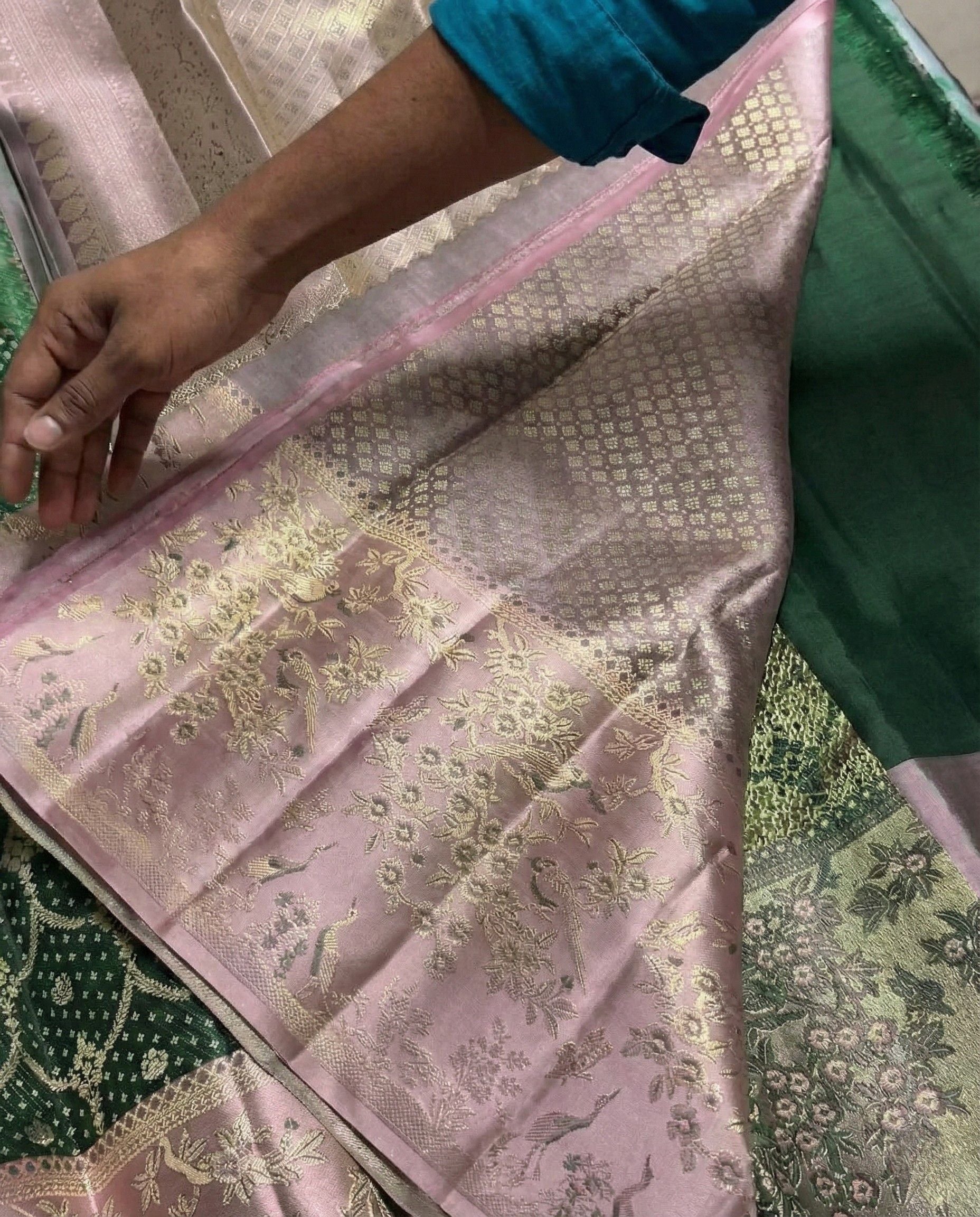 Rich green and pink Kanchivaram silk saree featuring traditional gold zari woven motifs with a broad contrasting border. Comes with an unstitched blouse piece.
